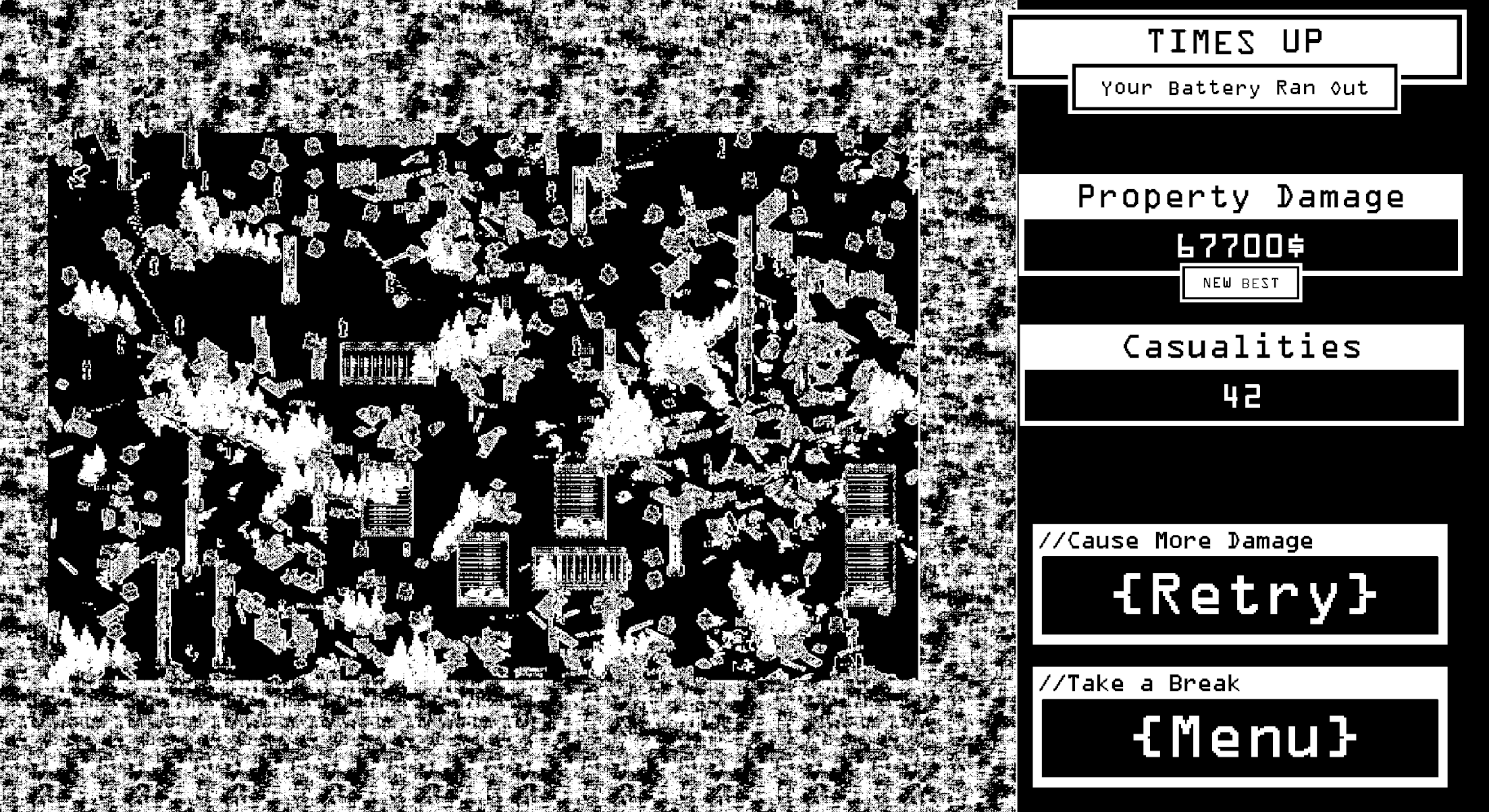 A Physics based Postal-like, where you play as an AI worker gone rogue, racking up as much property damage as you can, before your battery runs out